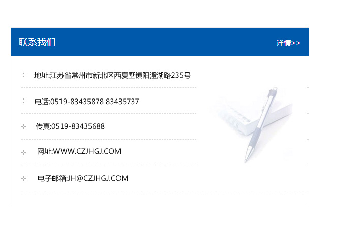 地址:常州市新北區友邦商務大廈1幢16、17層  電話:0519-85101652  傳真:0519-85112595  郵編:213022  網址:www_cz-jiayue_cn.hn-tiansheng.com  郵箱:xiajifengaa@163.com